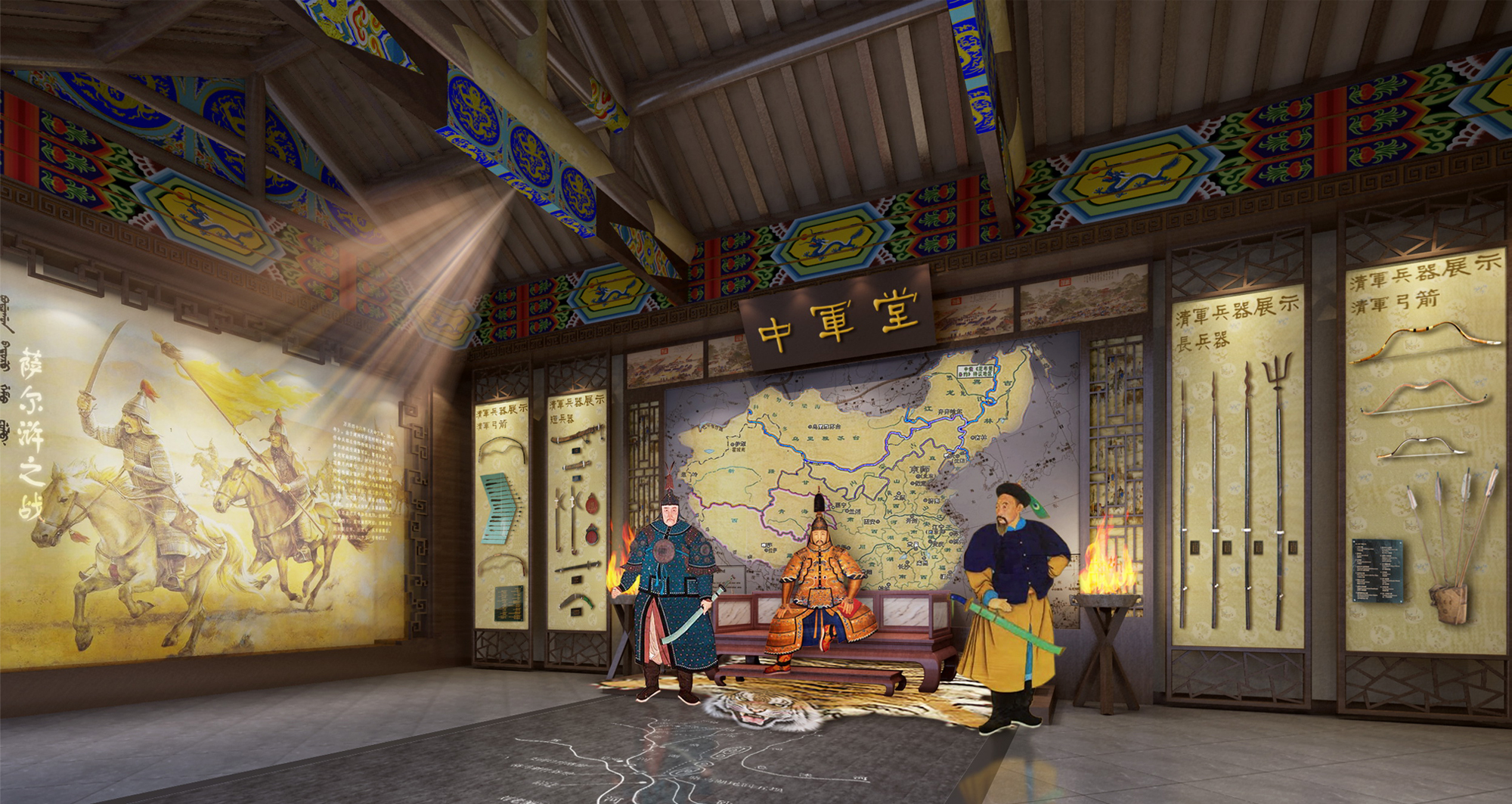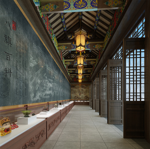方案設計摒棄原來單一以“展廳”形式為主的流陳,增加了多處場景還原,真實再現(xiàn)當年八旗子弟生活工作的場面。此案在設計上巧妙的把滿族文化融入到生活場景中,如“滿族萬字坑”“清代閨房”“神桿”等,再輔以古色古香的墻面石刻與展柜,在有限的空間內(nèi)盡可能完整全面的呈現(xiàn)八旗文化。