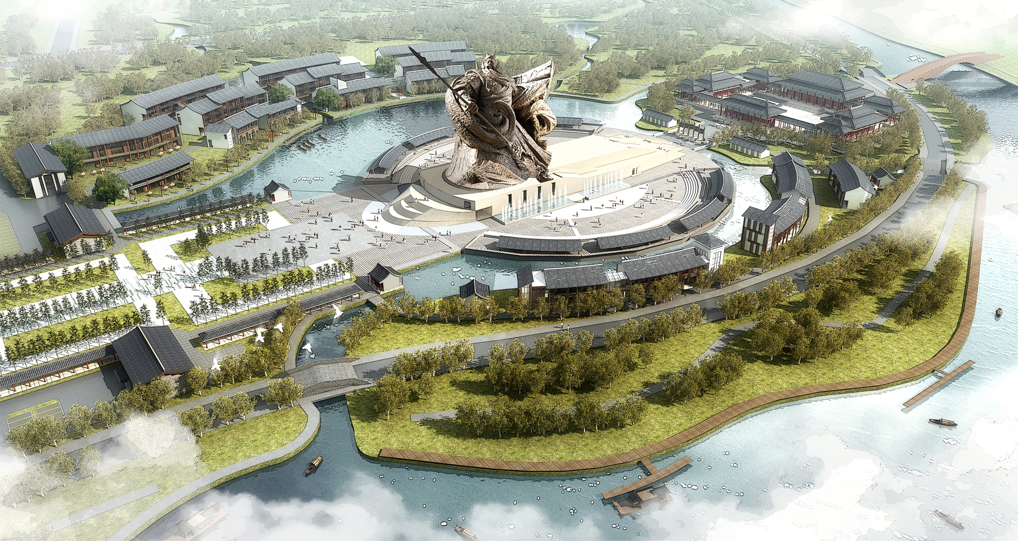 關(guān)公文化園位于湖北省荊州市,在園區(qū)布局上由南向北進(jìn),以“義”的概念貫穿園區(qū)規(guī)劃。 圣像基座、園區(qū)環(huán)境、配套建筑突出雕像”義薄云天“的氣勢(shì)。中軸主要建筑群,以關(guān)公圣像為核心。而圣象又以雕塑建筑化為手法,在其基座內(nèi)建設(shè)關(guān)公紀(jì)念館,營(yíng)造祭祀、表演、眺望、景仰空間。