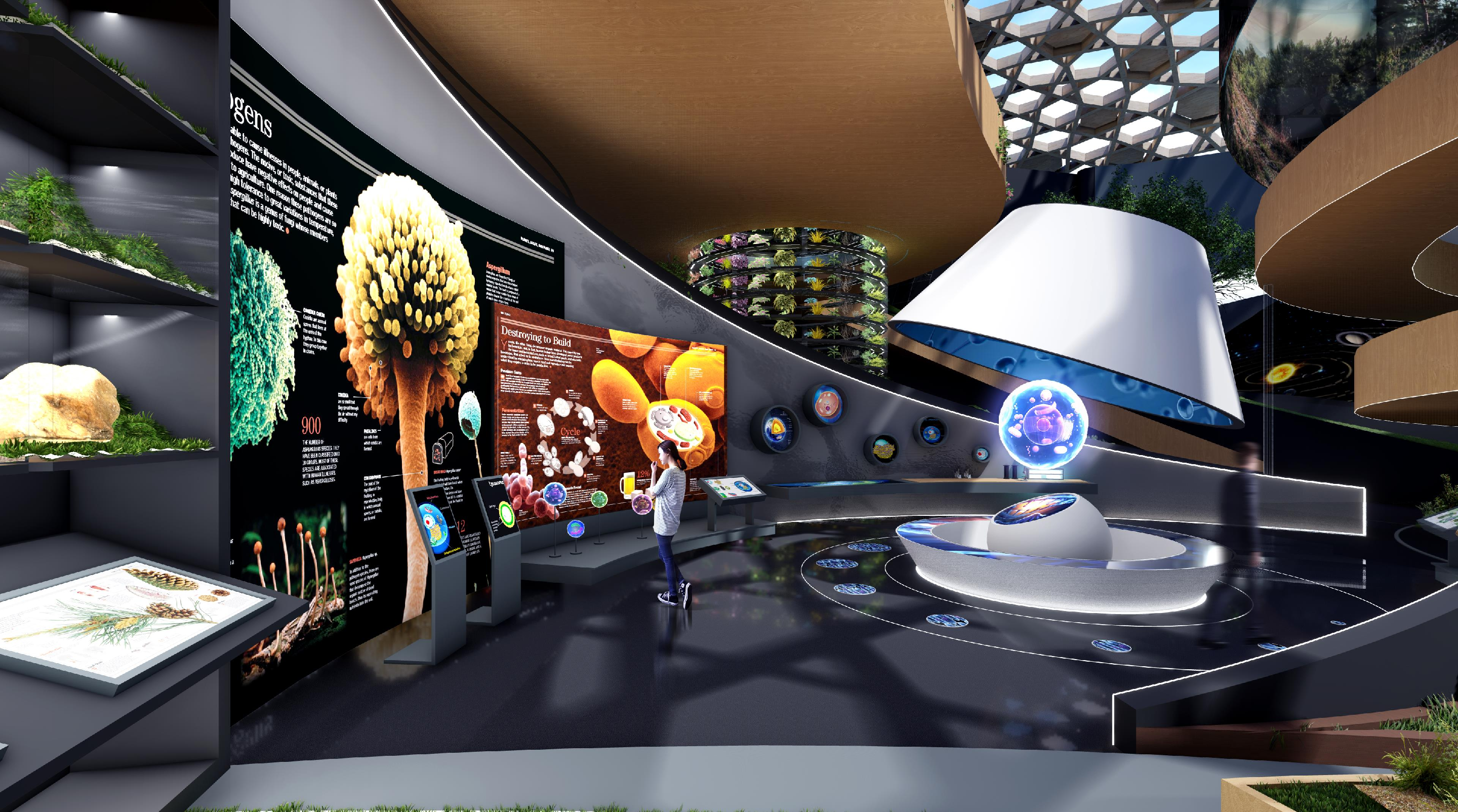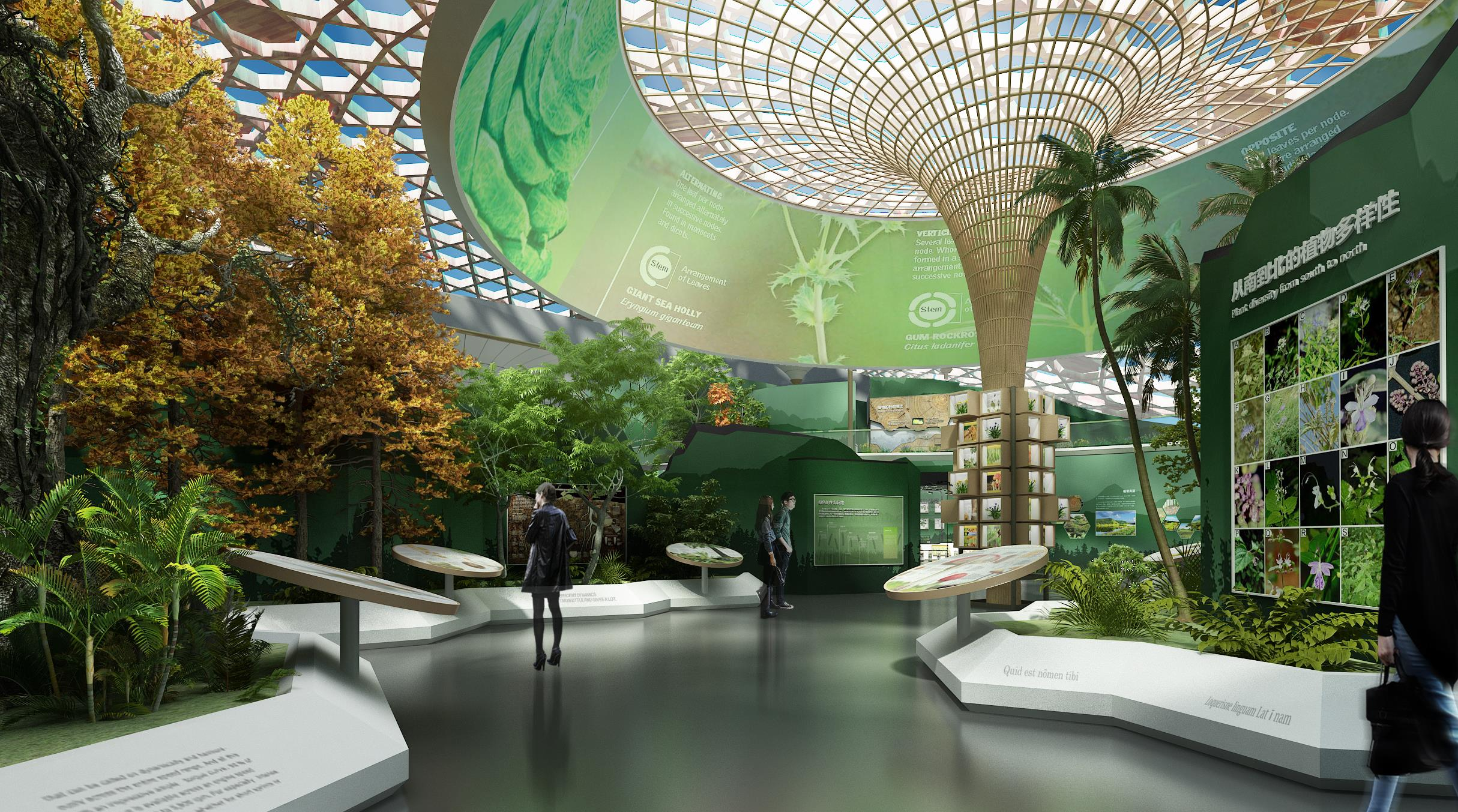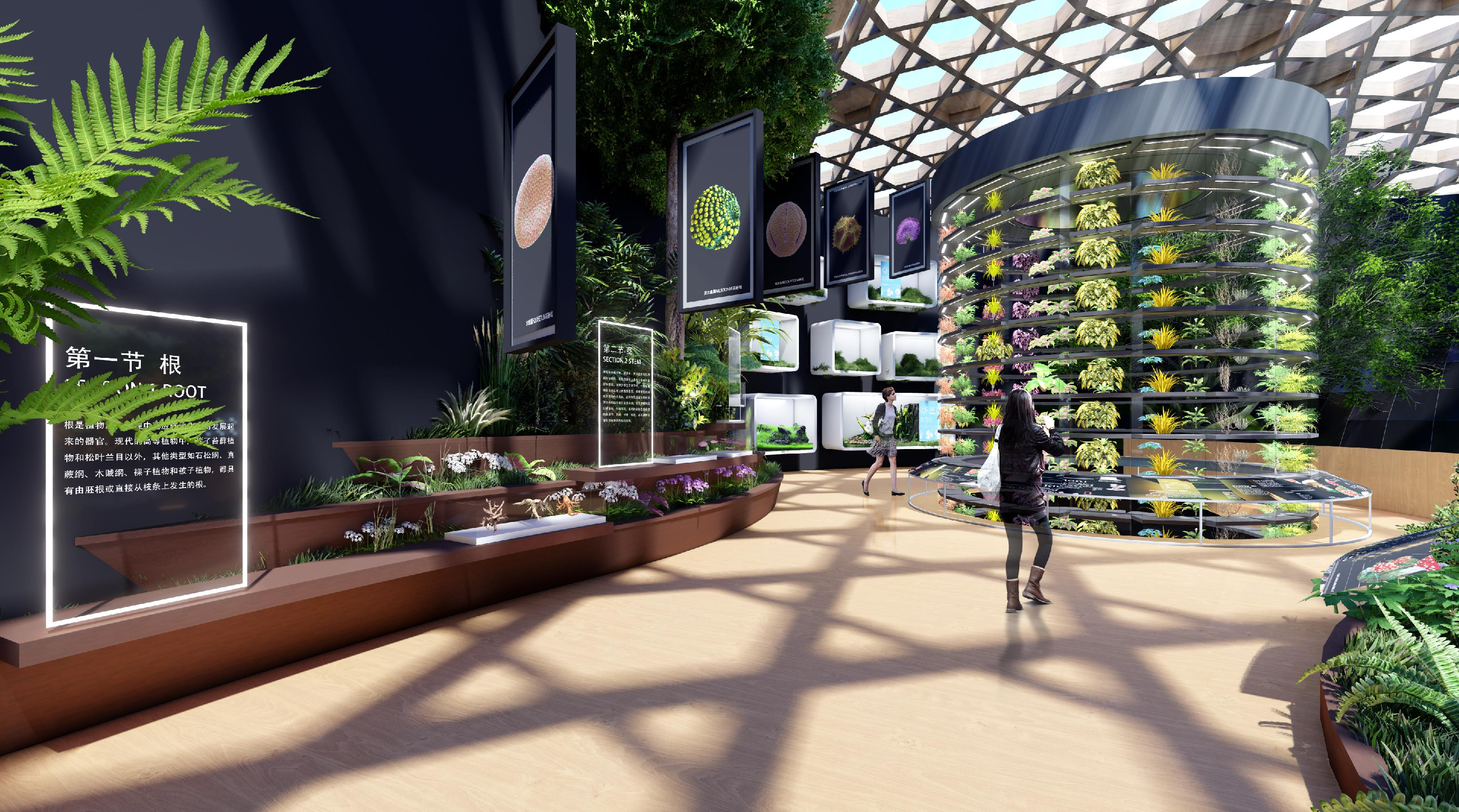 國家植物博物館分為博物館主館、藥博館、溫室等展館區域。金螳螂文化擔綱設計國家植物博物館展陳,以“原本山川,極命草木;關心植物,關注未來”為基本主題,分為3個部分和10個單元展開規劃設計。