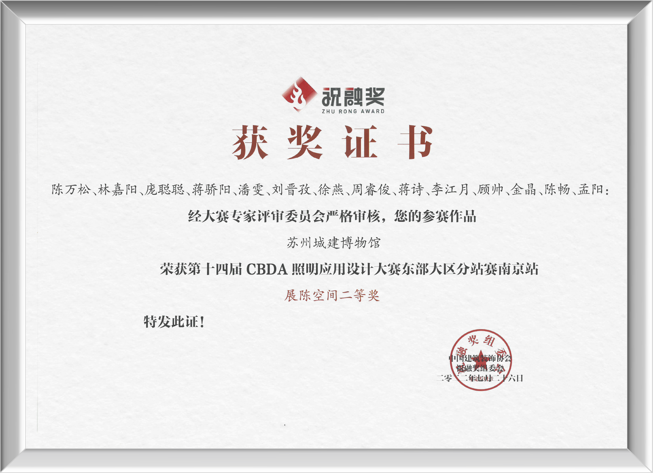 當(dāng)晚的頒獎典禮上,組委會正式公布了2022年度祝融獎東部大區(qū)分站賽(南京)各空間獎項、佳作獎、優(yōu)勝獎等榮譽。金螳螂文化憑借作品蘇州城建博物館榮獲展陳空間二等獎。